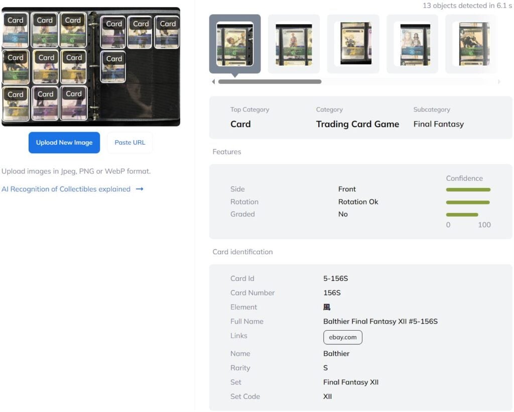 In this example, I tried the recognition of Final Fantasy trading cards in a low-quality binder image via our card ID demo. The largest detected card was identified as Balthier Final Fantasy XII #5-156S, with details including card side, rotation, grading, ID, number, element, full and short name, rarity, set and set code, and a link to eBay.