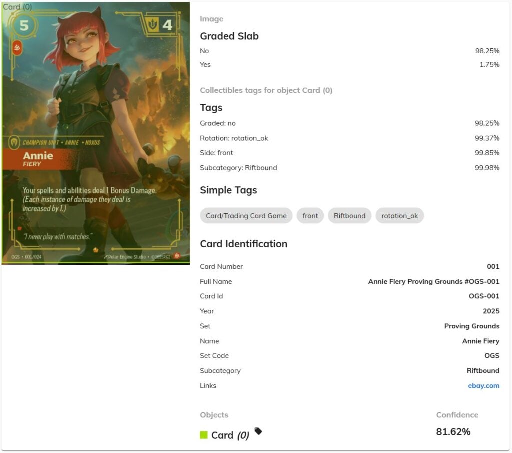 For this example, I tested an Annie Fiery card via Ximilar App. The test form can be found under Collectibles Recognition: TCG Identification. The system provided Annie Fiery’s category, side, set, full and short name, year, card number, card ID, subcategory, and a link to eBay listings.
