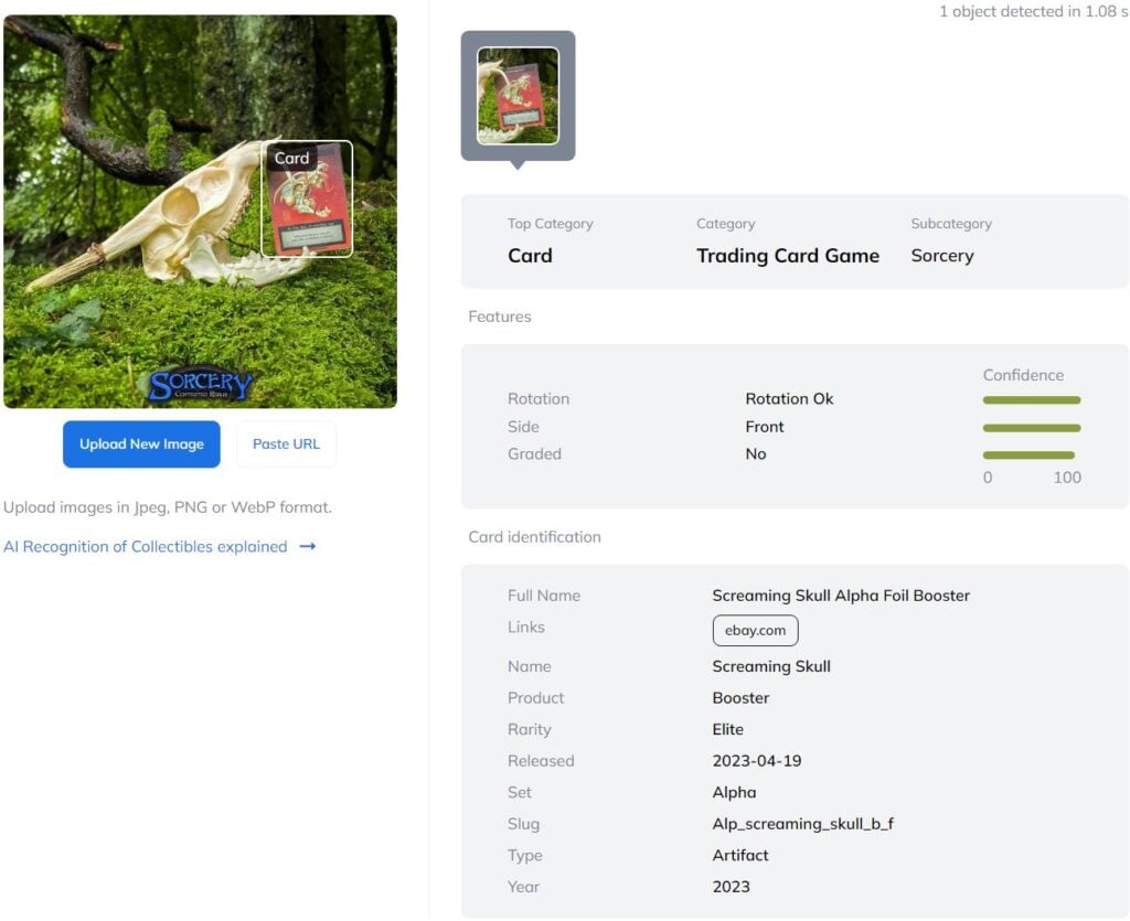 In this example, I uploaded a staged promo image from Sorcery’s website, showing a small, tilted card, to Ximilar Demo. The system accurately detected the card’s position and identified it as Screaming Skull, providing details such as grading status, short and full name, release date, rarity, set slug, type, year, and a link to eBay – all in just 1.08 seconds.