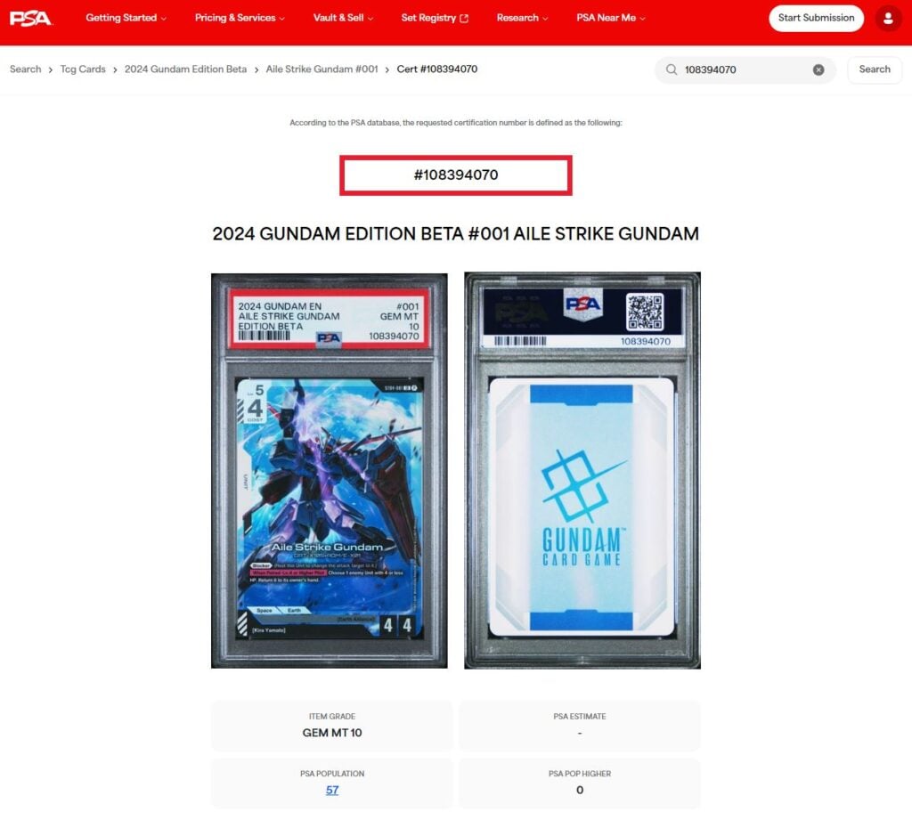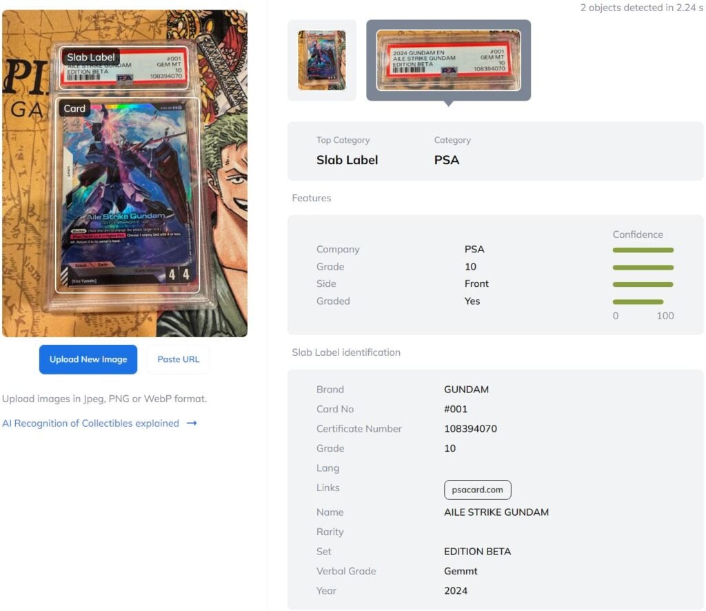 For testing, I used a user-generated image of a graded 001 Aile Strike Gundam card in a labelled slab. The system accurately identified the game and card details – including card ID, side, number, full and short name, set with code, and a link to eBay.