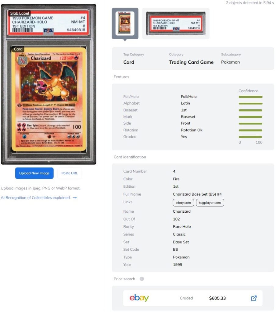 Let’s test the upgraded trading card game recognition system on a true legend – the 1999 Base Set Charizard Shadowless Holo (#4), graded by PSA as 8 Nearly-Mint and currently listed on eBay for $39,999.99.